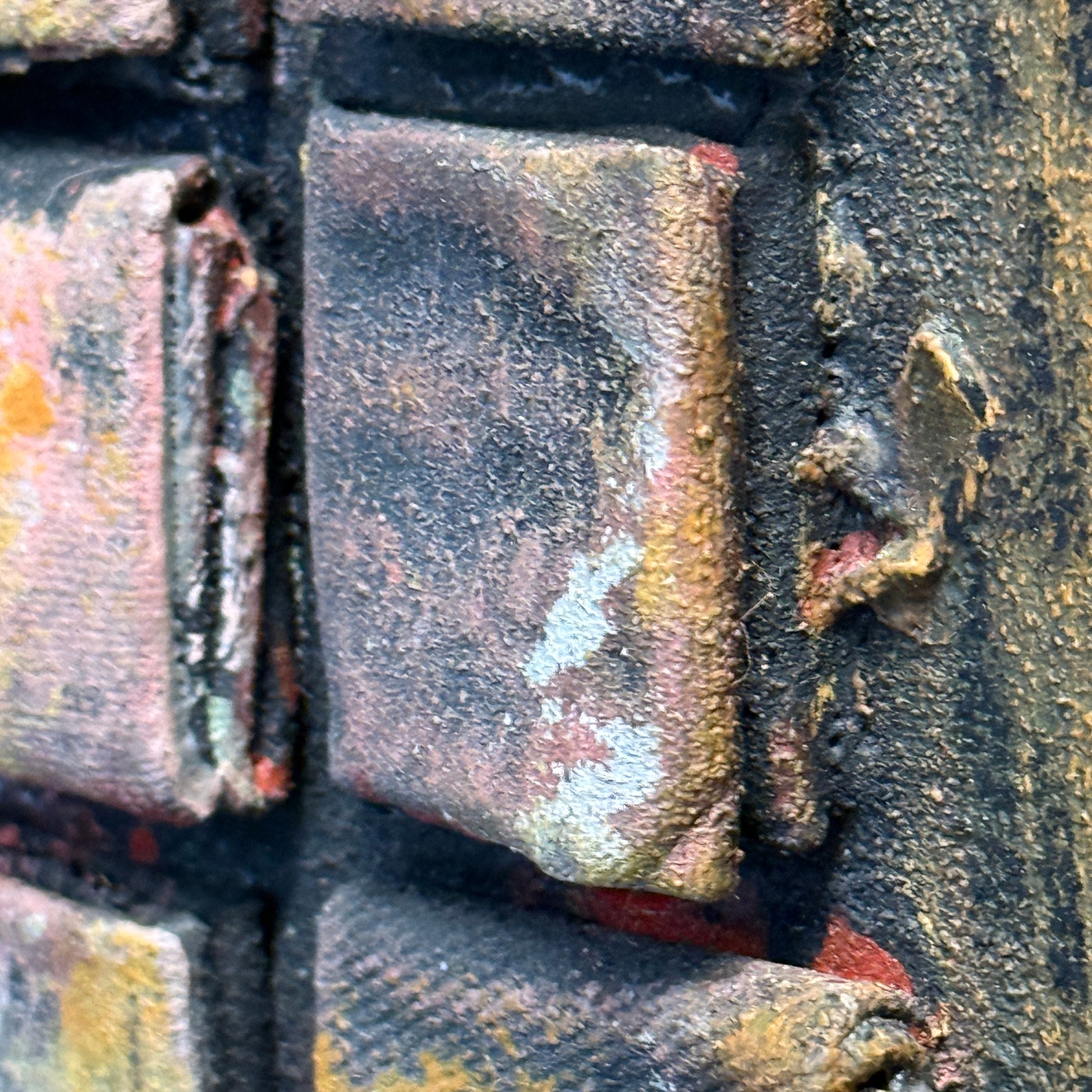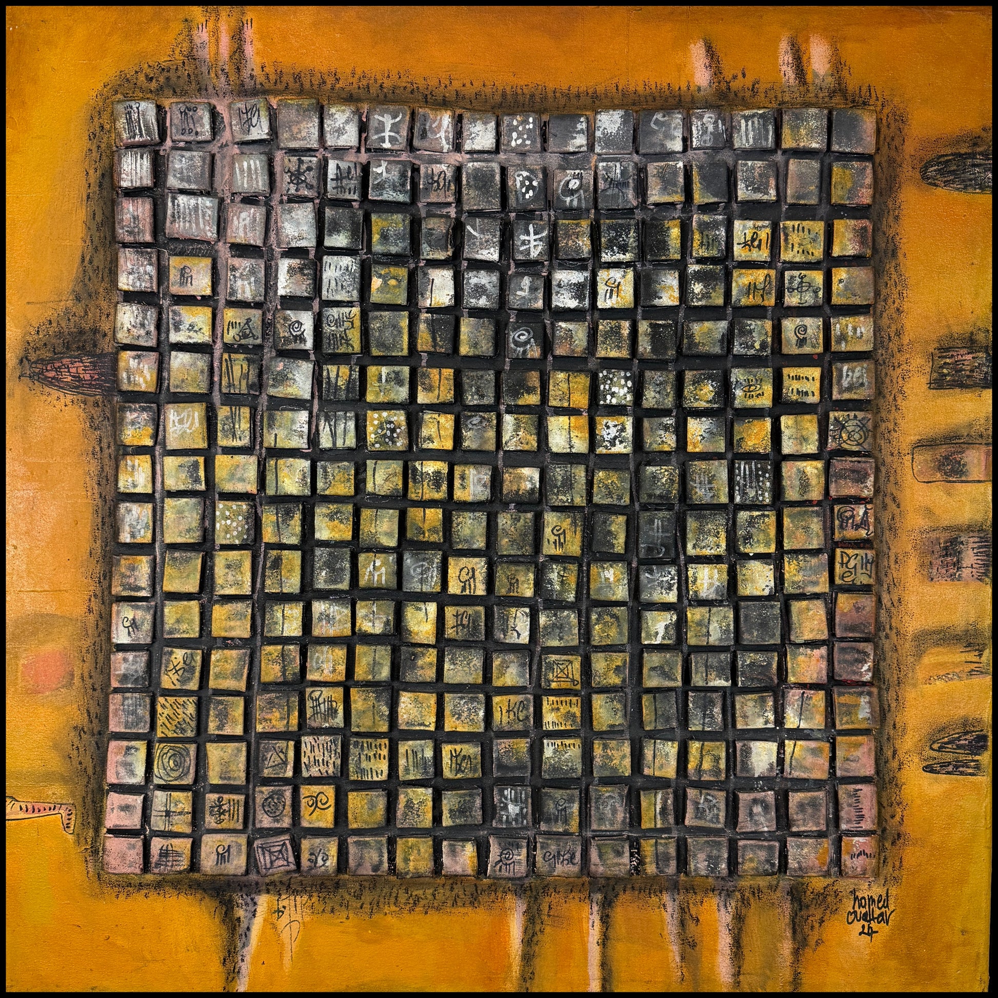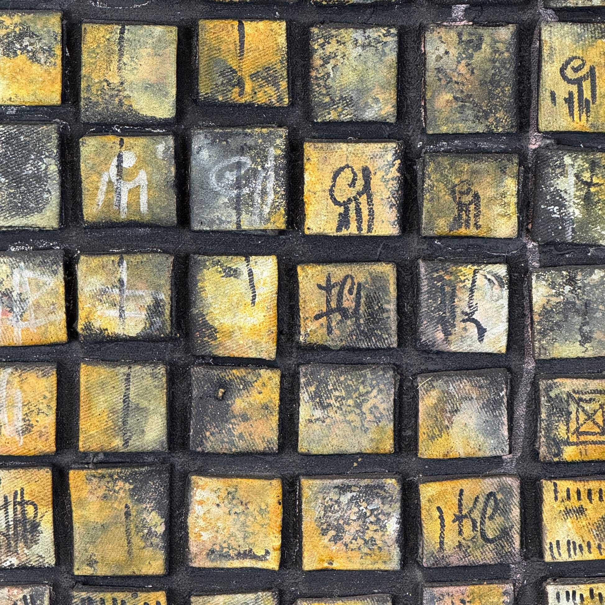 “Backwards Future” reflects on the tension between digital pixelisation and ancestral spirituality. Constructed from folded canvas and layered collage, the work transforms traditional signs into a fragmented grid that recalls both ancient codes and digital screens. This paradox illustrates a world moving forward while imitating the past — not in the right direction — echoing the dissonance of a humanity disconnected from its androgynous roots.