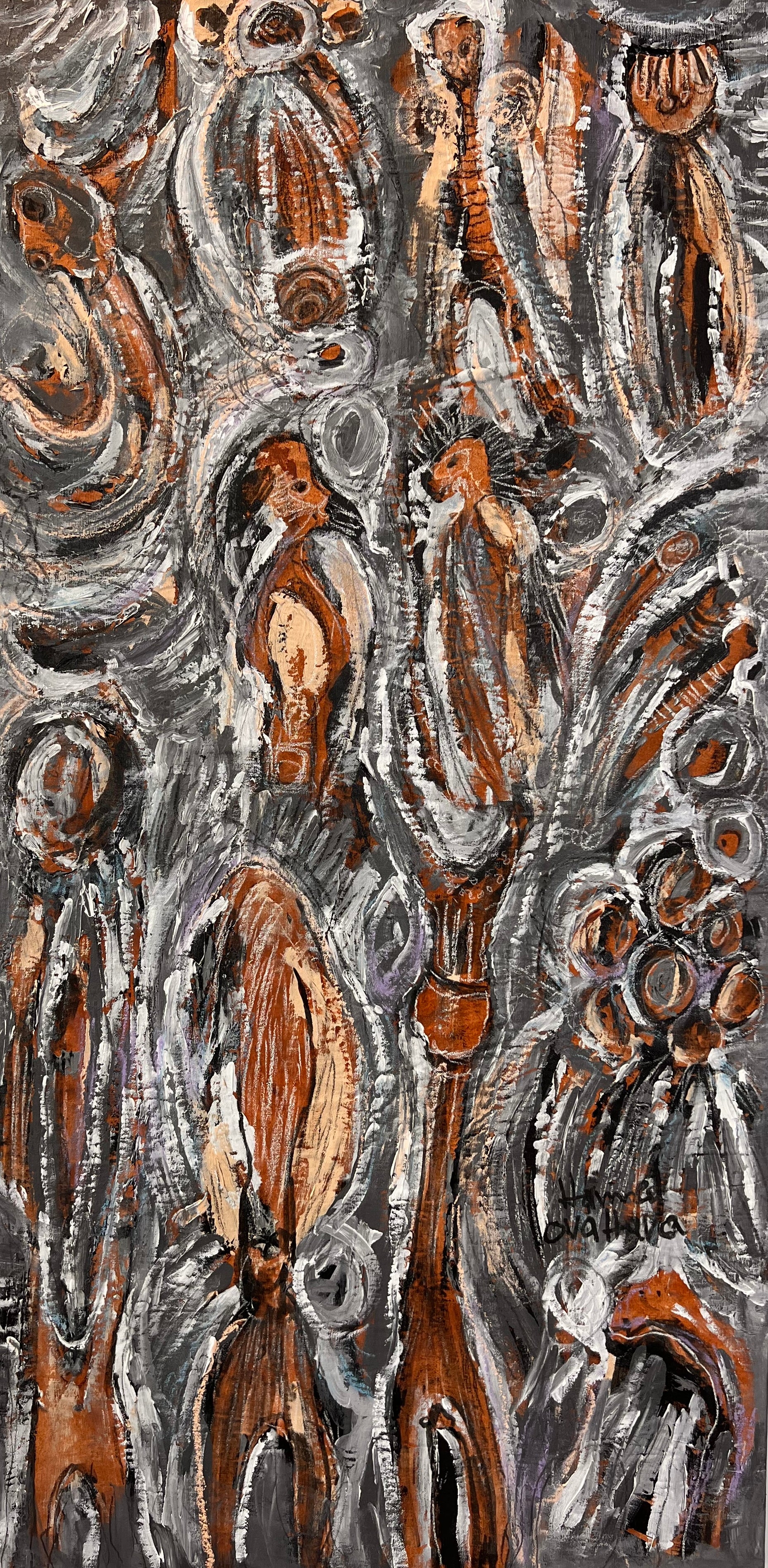 “Echoes in Motion” is a vertical canvas where abstracted figures and fluid gestures overlap within a dense composition. Rendered in earthy browns, whites, and greys, the forms oscillate between human silhouettes and organic patterns. The layering of strokes creates a sense of movement and vibration, evoking ritual presence, ancestral energy, and cycles of transformation.