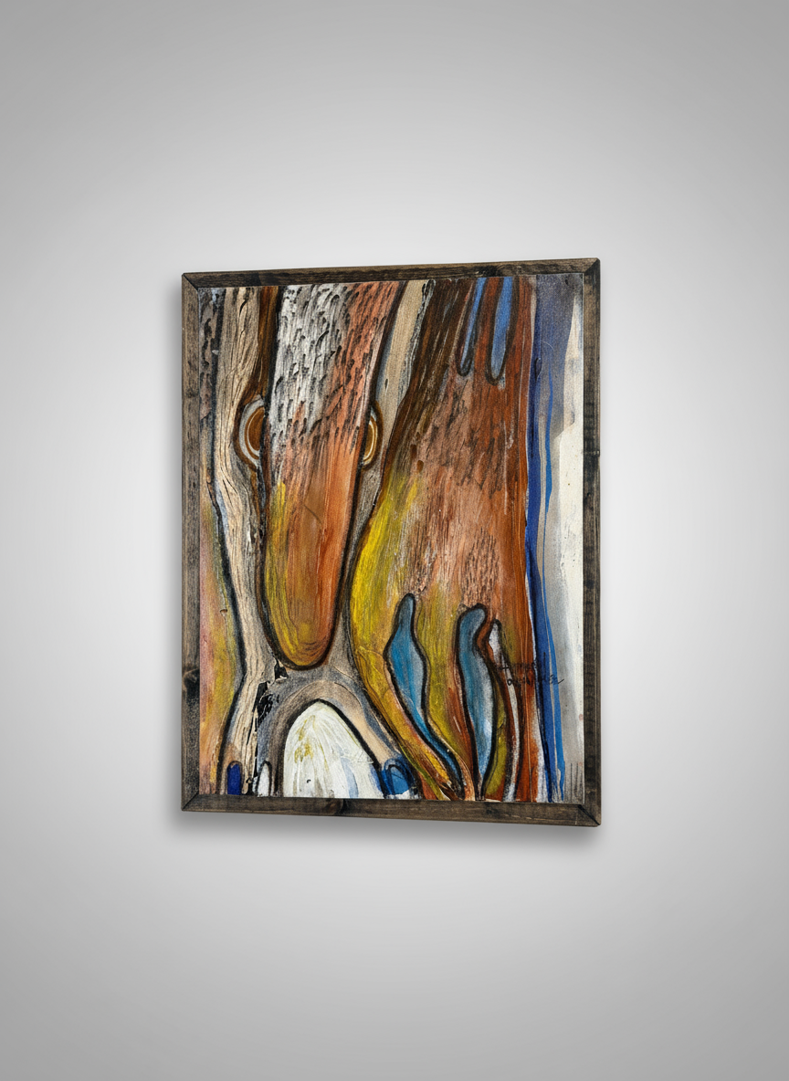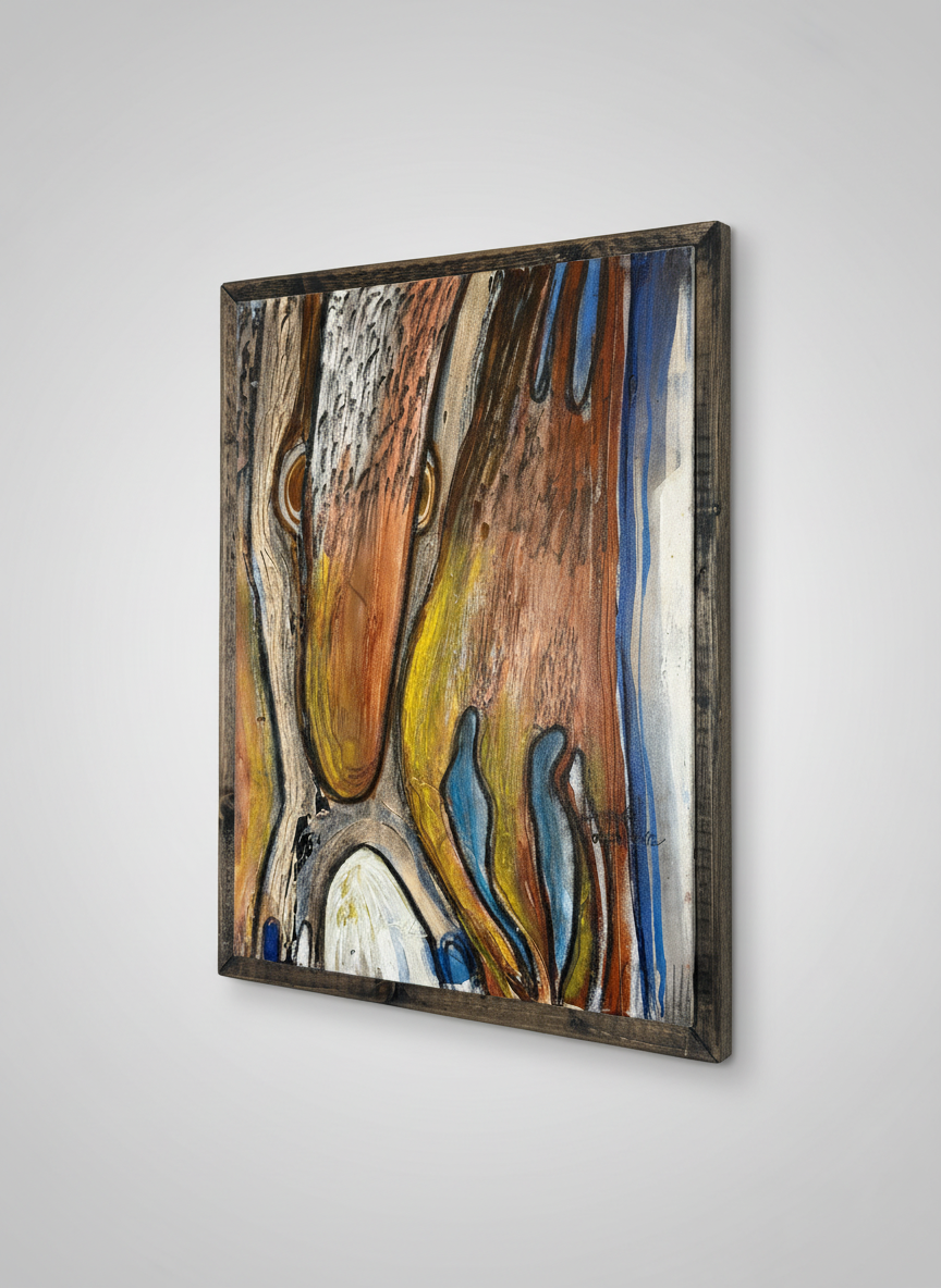 Flame of the Ancestors ignites a dialogue between memory and metamorphosis. Flowing forms rise from an earthen base toward vertical fields of burnt sienna and blue, evoking the fusion of fire and spirit. The organic textures recall tree bark and ritual markings — traces of life transformed into energy. Through his tactile gestures and folded canvas technique, Hamed Ouattara translates ancestral vibration into contemporary abstraction. The work radiates warmth, movement, and renewal — a visual offering to the ever-living flame of origin.
