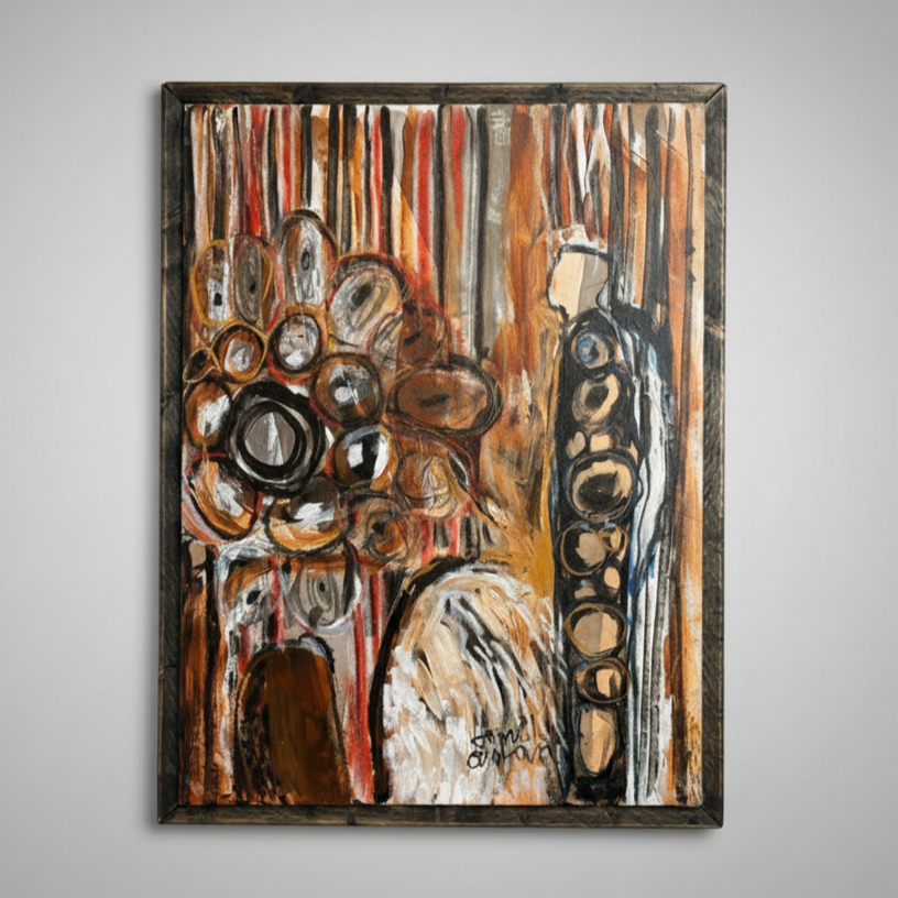 Roots in Resonance embodies the pulse of memory embedded within material and form. Concentric circles emerge like seeds of sound or ancestral echoes, vibrating through vertical streaks of earth and rust. A standing figure seems to rise in dialogue with these organic rings — both guardian and witness of invisible energy. Hamed Ouattara’s technique of layered acrylic and folded canvas turns each texture into a living vibration, balancing rawness and refinement. This work channels the deep rhythm of Africa’s soul — where art becomes both vessel and resonance of timeless heritage.