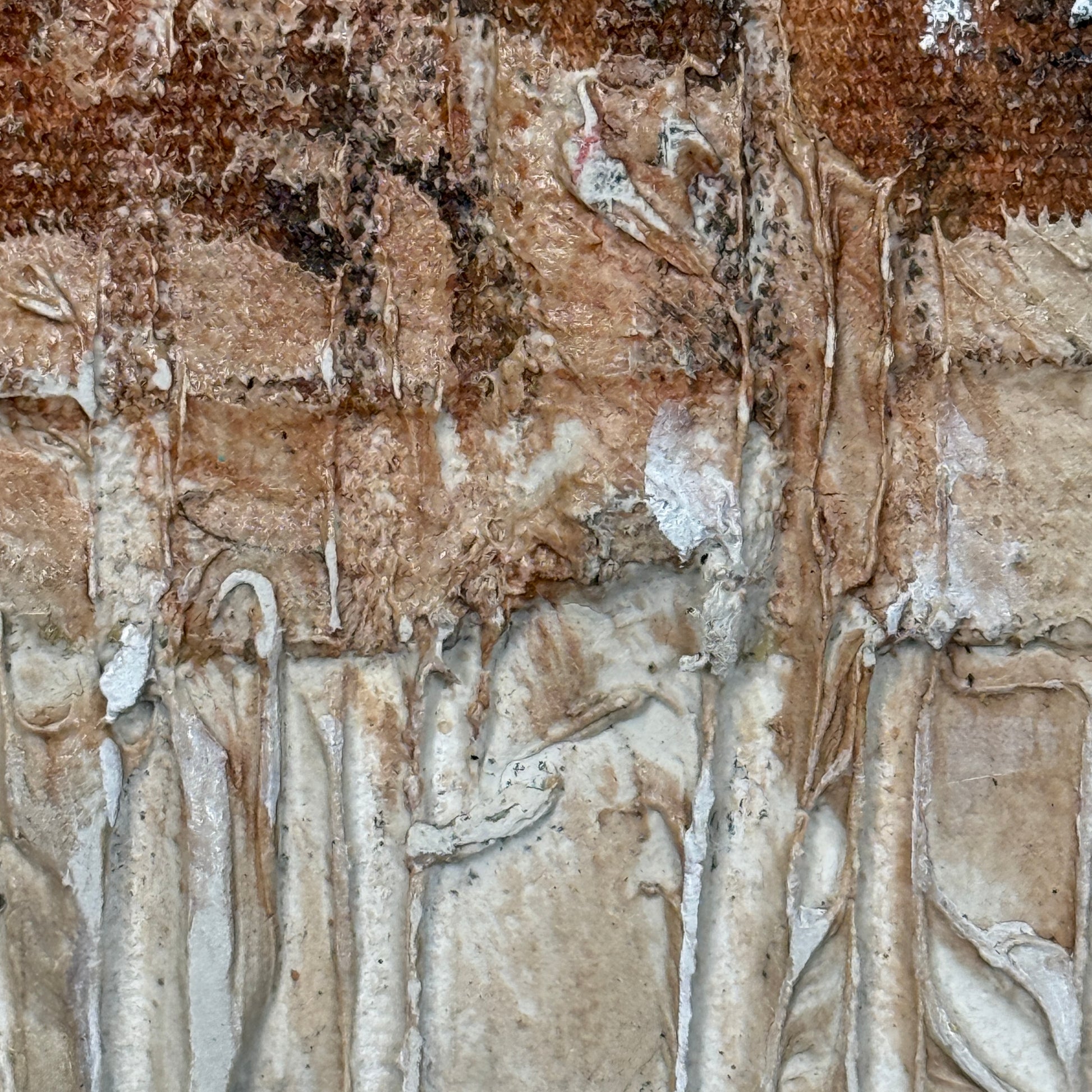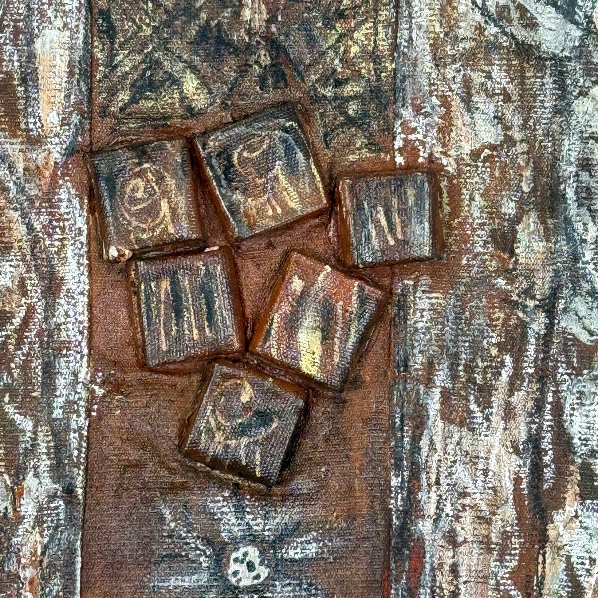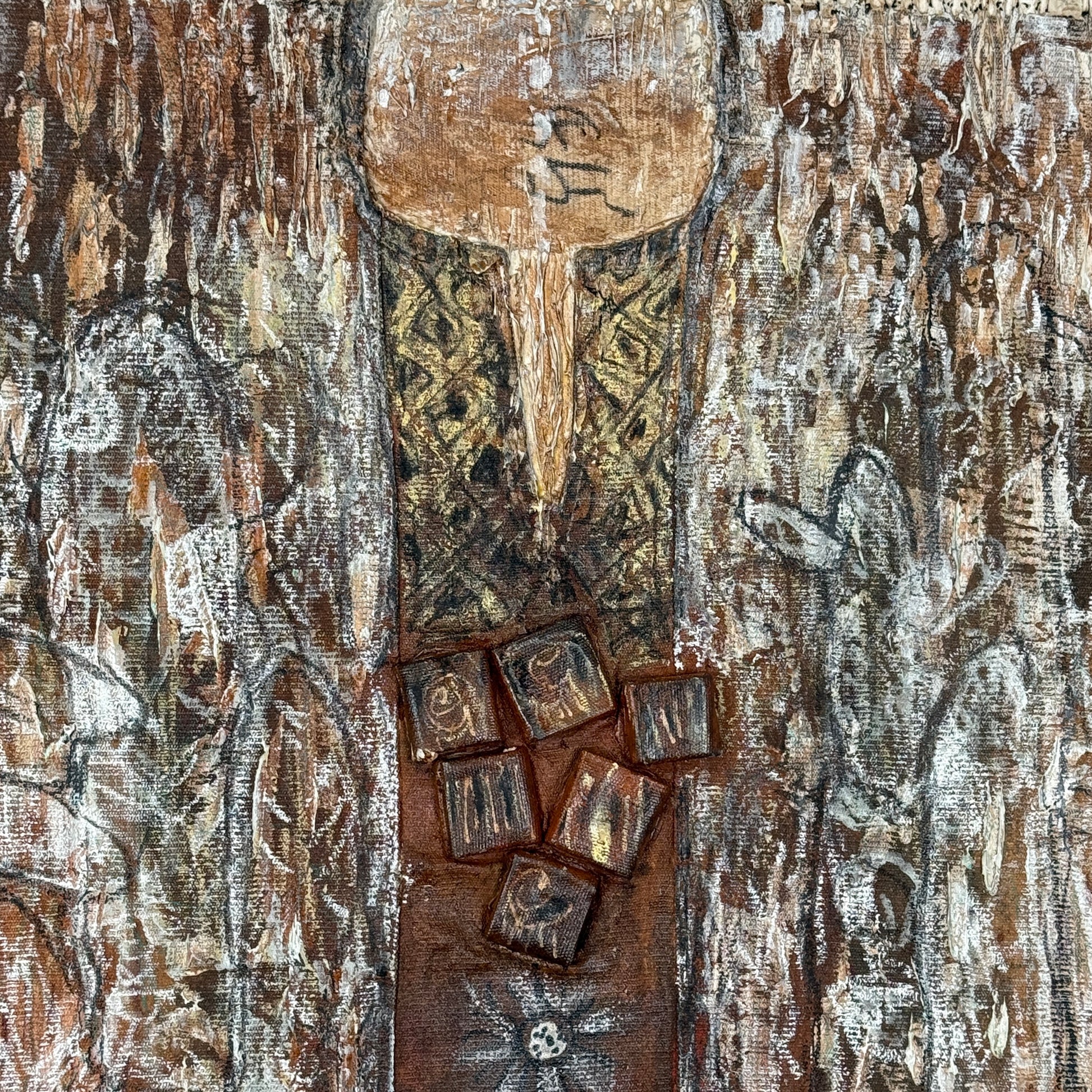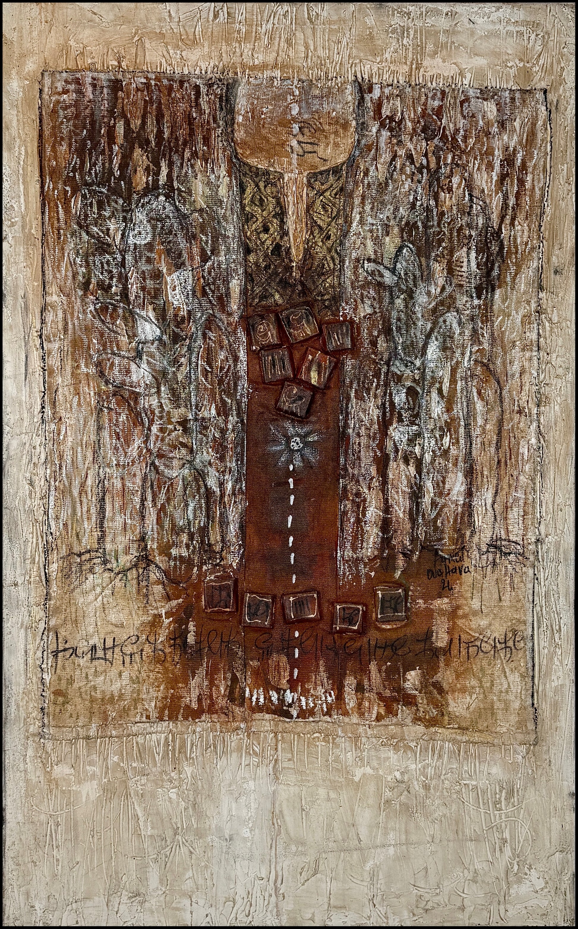 “Pathways” is a textured vertical composition where layered collage and folding techniques shape a central axis of symbols and earthy tones. The interplay of relief and painted gestures suggests both rootedness and movement, evoking the idea of a sacred path marked by memory and transformation.