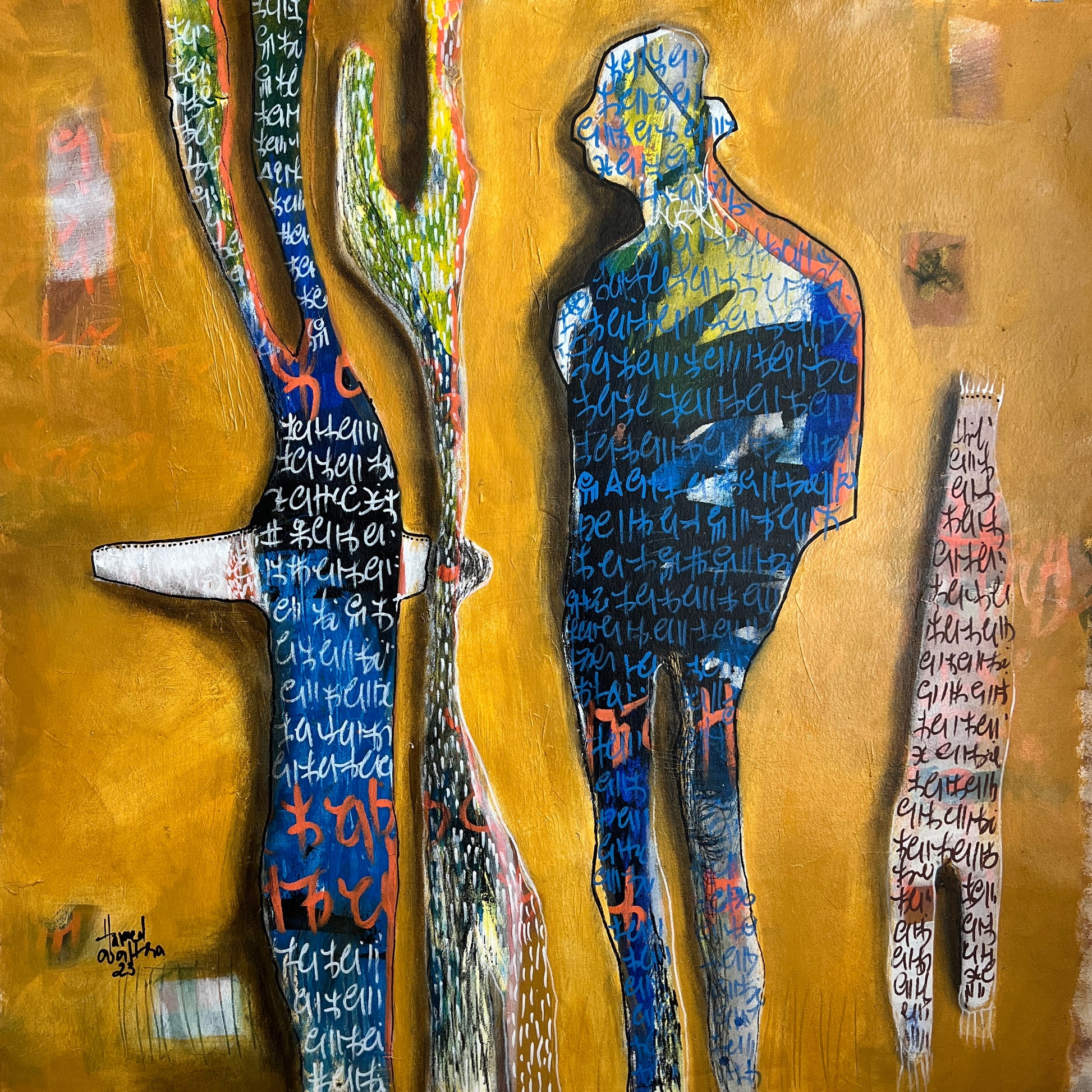 “Wisdom” depicts human silhouettes inscribed with layers of instinctive signs and markings. The deep blue figure and vertical forms stand against a golden background, symbolizing knowledge, memory, and ancestral voices that persist across time. The balance between figure and symbol suggests the coexistence of lived experience and inherited wisdom.