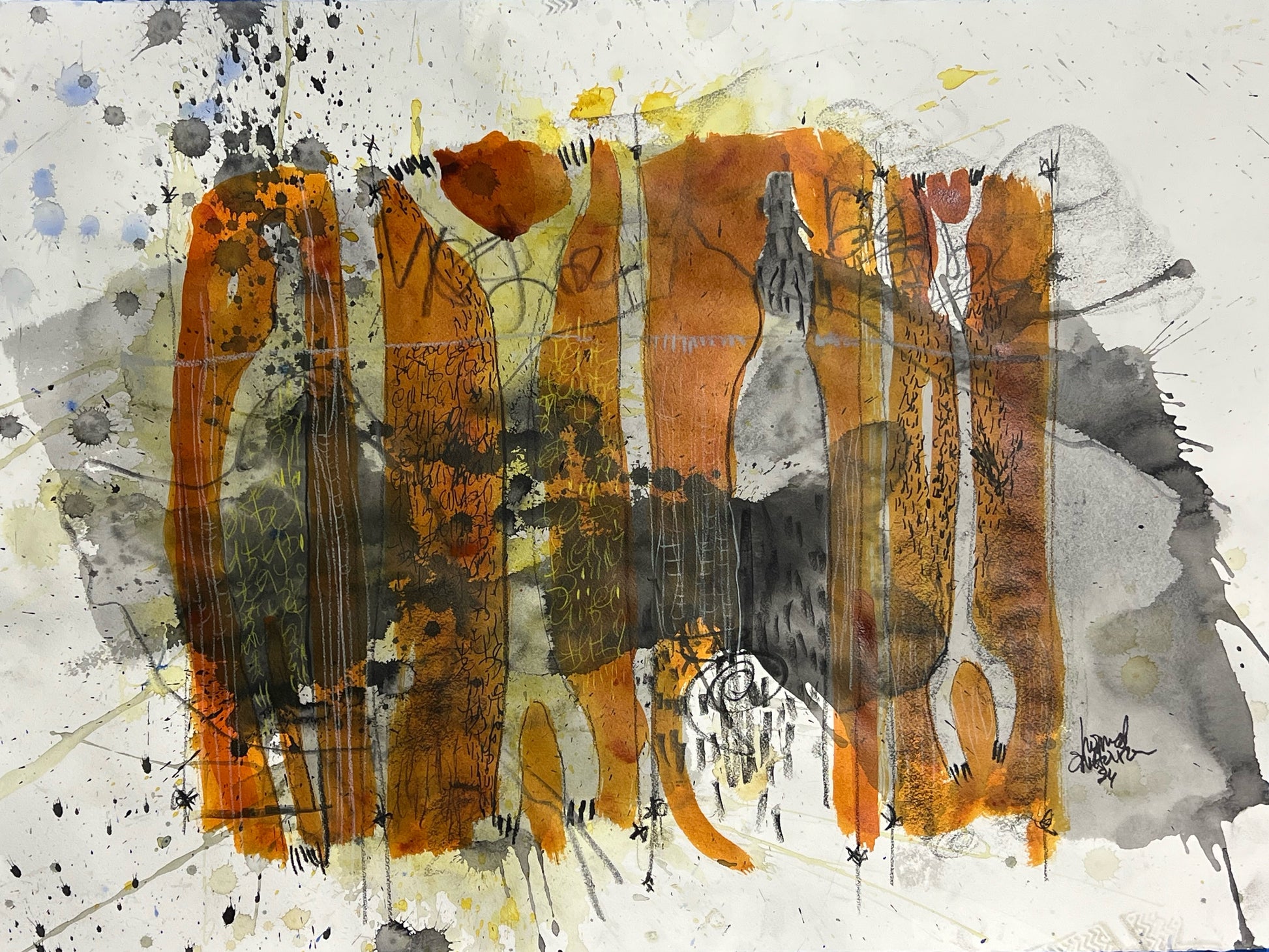 “Voices in Silence” unfolds on paper through fluid gestures and earthy tones. Elongated human forms appear within layered washes of orange and grey, suggesting presences that emerge and dissolve. The work balances spontaneity and control, evoking silent exchanges between figures, memory, and the ephemeral.