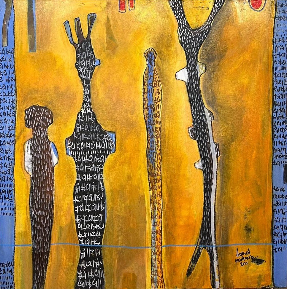 “Secret Society” portrays elongated silhouettes marked with instinctive inscriptions, standing against a luminous golden ground. The interplay of coded signs and symbolic forms suggests hidden knowledge and ancestral rituals. The work invites viewers to reflect on the unseen structures that shape identity, memory, and collective belonging.