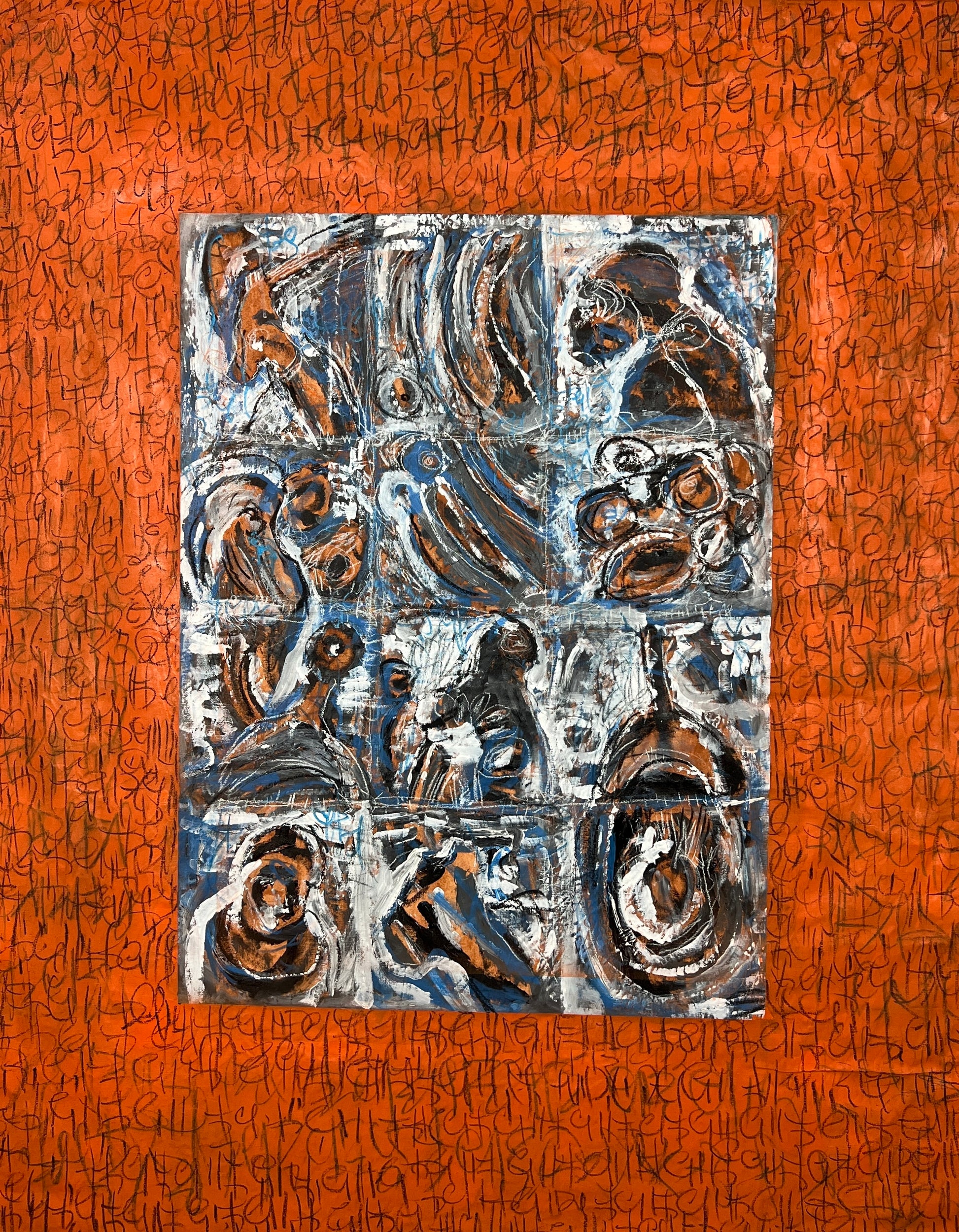 “The Weight of Memory” juxtaposes a vibrant orange field inscribed with instinctive symbols and a central block of abstract figures. Within the inner grid, fragmented forms emerge in earthy browns, whites, and blacks, evoking layers of remembrance and erasure. The bold contrast between the radiant background and the textured core suggests the heavy presence of memory carried across generations, both fragile and enduring.