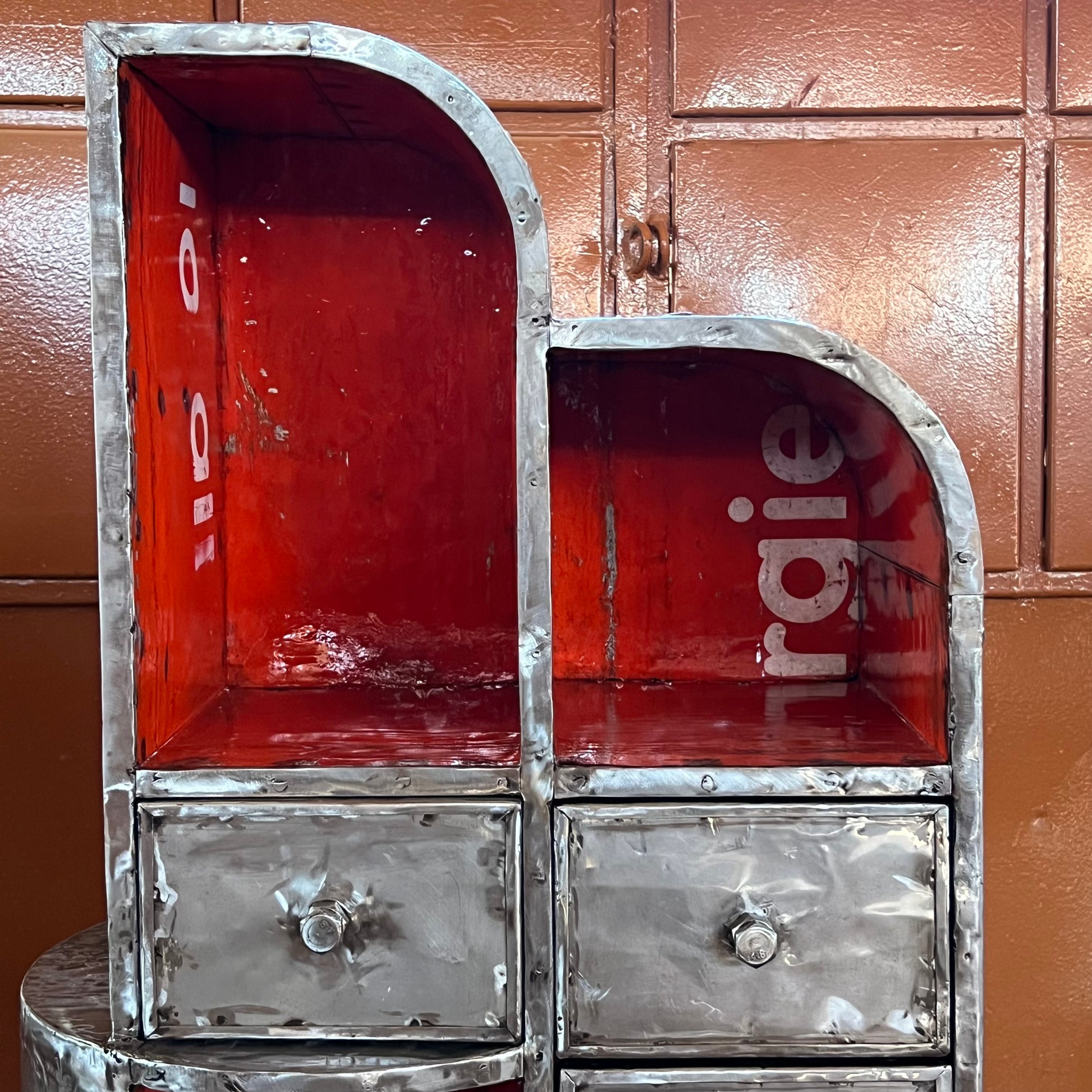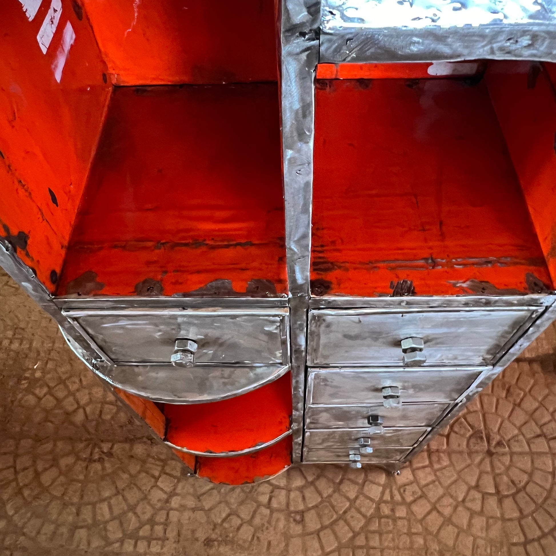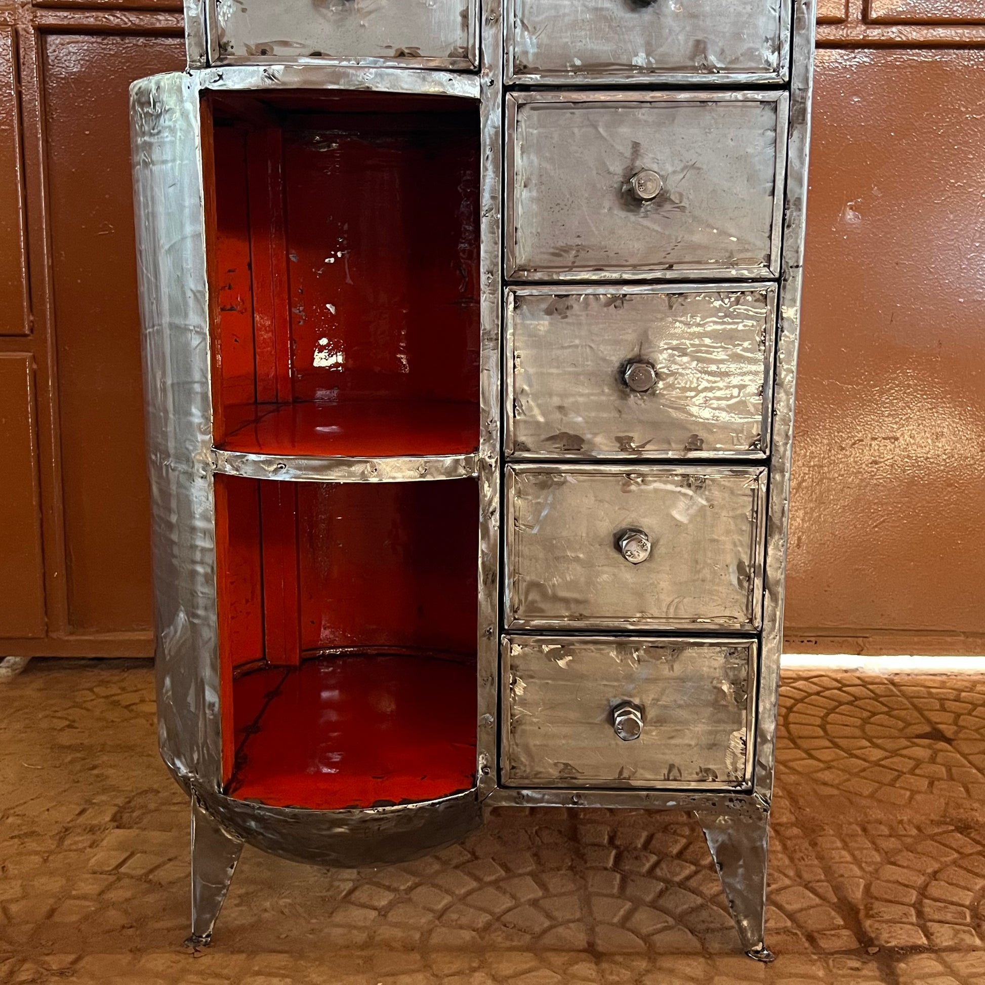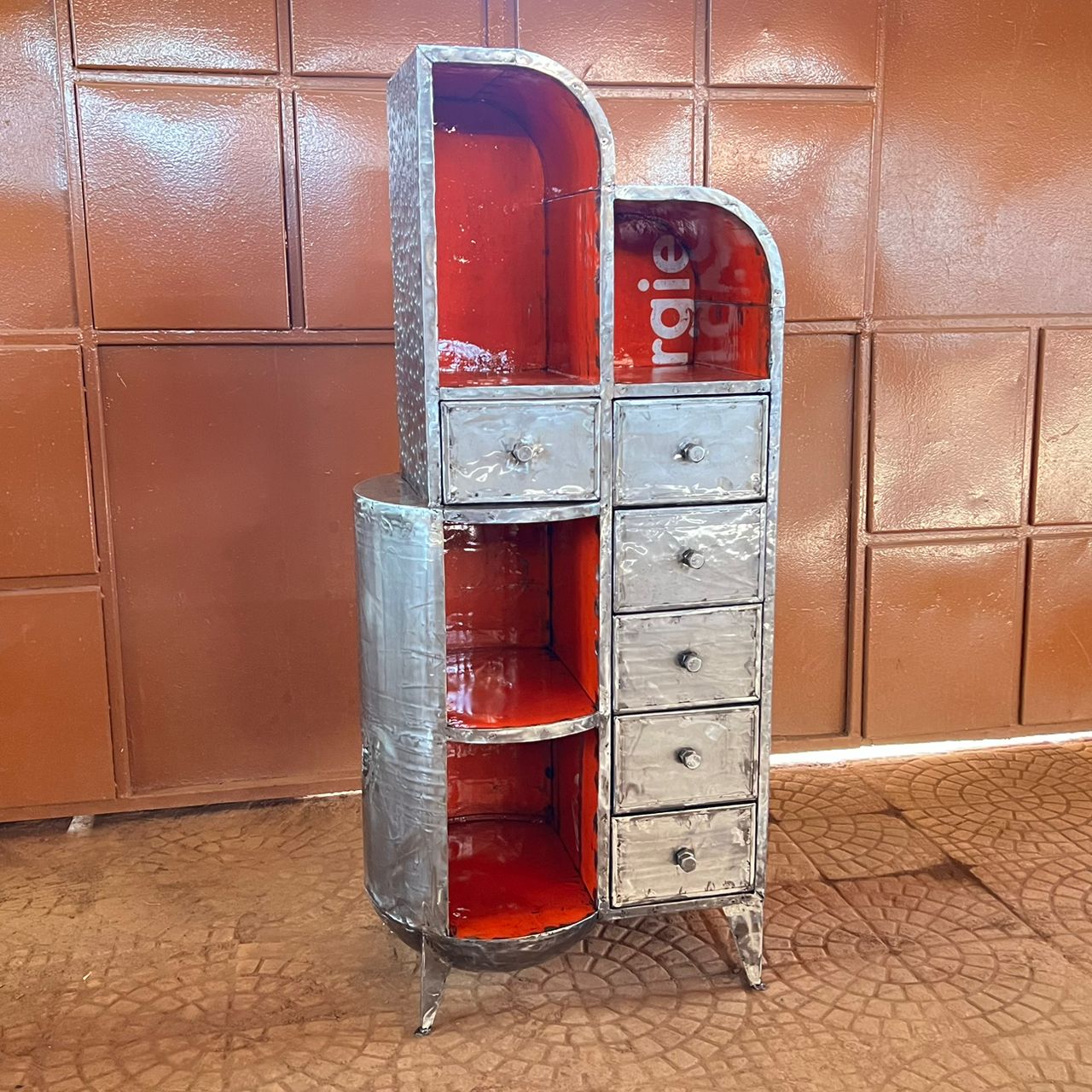 The “Toussian” cabinet is a creative and sustainable storage piece handcrafted from a repurposed oil barrel. Its bold red interior contrasts with the industrial metallic exterior, highlighting the unique aesthetic of recycled materials. With multiple drawers and open shelves, this cabinet combines industrial charm with modern functionality, making it both a design statement and a practical furniture piece.