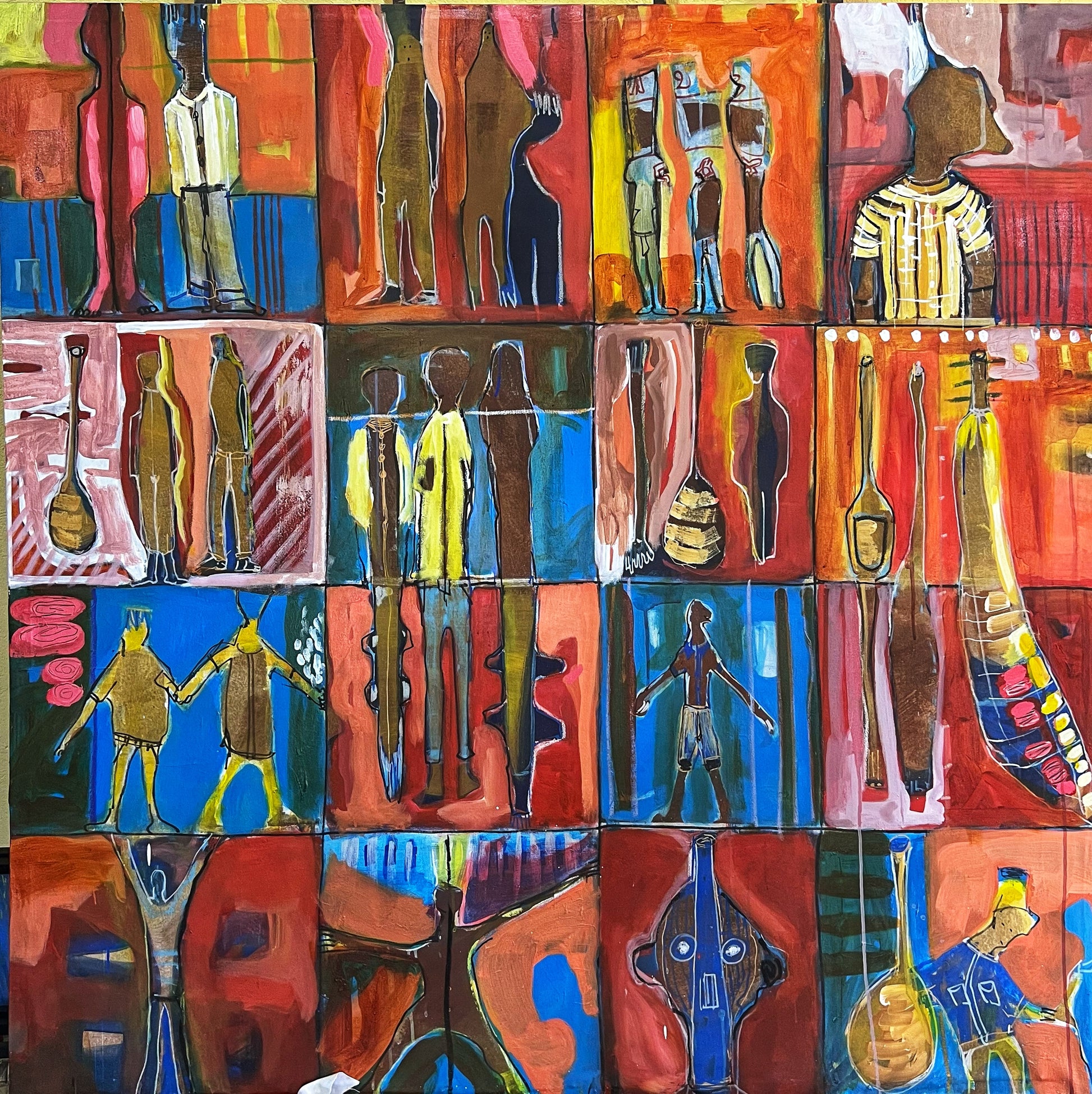 « Rituels urbains » est une peinture acrylique monumentale d'Hamed Ouattara, où des rouges, des oranges et des bleus vifs se mêlent à des figures stylisées et à des instruments traditionnels. La composition se déploie comme une mosaïque de rencontres humaines, de gestes rituels et d'échos ancestraux, rendus par des traits audacieux et des couleurs superposées.