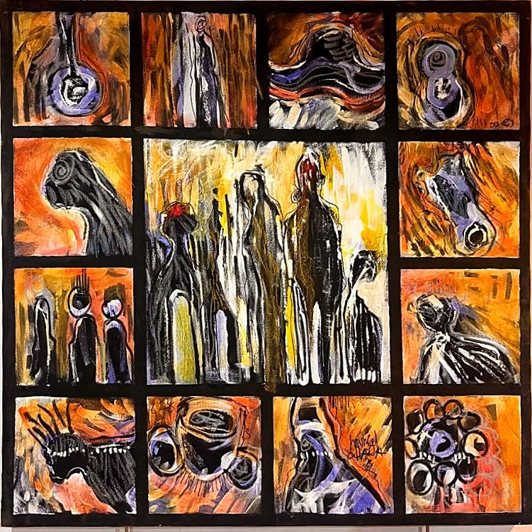 “Voices in Fragments” presents a composition divided into multiple framed sections, where human silhouettes and abstract forms coexist. The central figures, painted in black and gold tones, stand tall amidst surrounding shapes and symbols, evoking dialogues between visible and invisible worlds. The warm palette of ochre, orange, and purple intensifies the sense of ritual, memory, and spiritual presence.