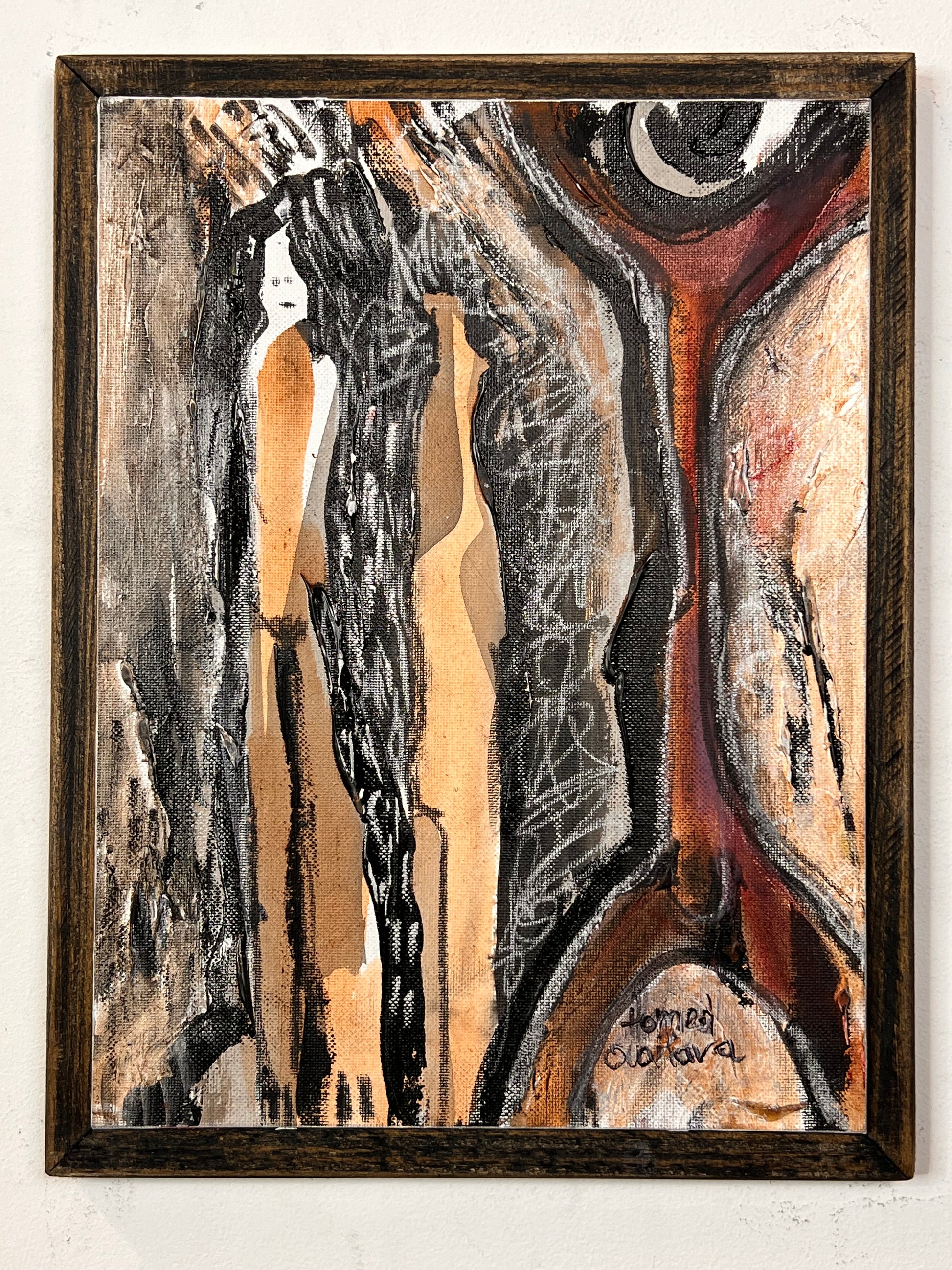 “Echo of Silence” explores the fragile presence of human forms emerging from layers of texture, silence, and ancestral echoes. Earthy tones blend with charcoal-like strokes, revealing an inner tension between memory and erasure. This intimate work captures both vulnerability and resilience within its compact format.